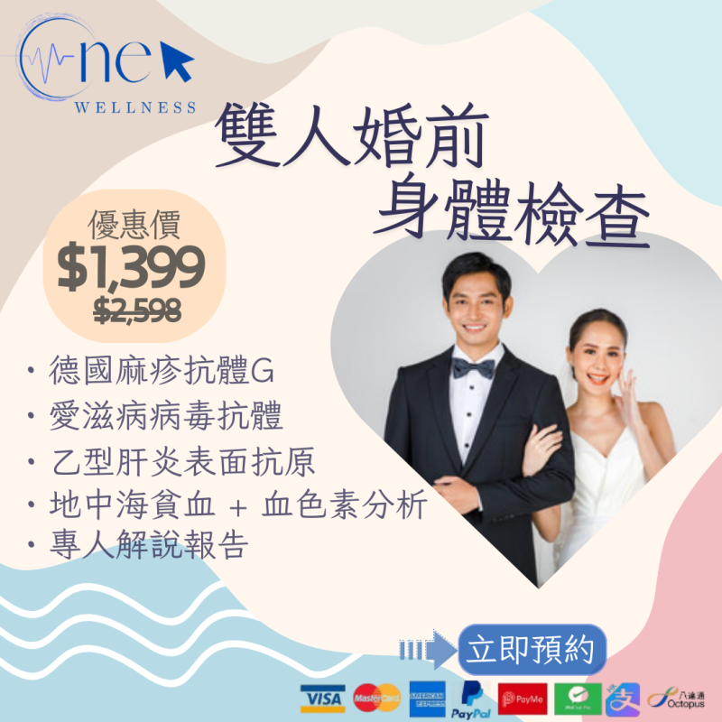 包括: 乙型肝炎表面抗原、愛滋病病毒抗體、血色素分析、梅毒血清試驗、類猴因子、德國痲疹抗體G、ABO血型 、精液分析 、常規檢查, 如: 膽固醇、小便狀況、中英文報告及專人解說報告 等等